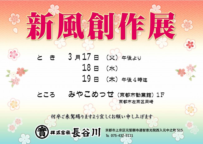 【新風創作展】日時:3月17日(火)~19日(木) 17日(火)午後より17時 18日(水)9時~17時 19日(木)9時~16時